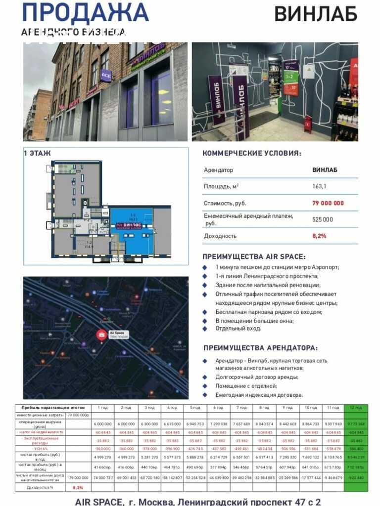 Лот № 222443 Продаётся помещение с арендатором (готовый арендный бизнес) Арендатор - Винлаб, крупная торговая сеть. Помещение располагается в 1 минуте пешком до станции метро Аэропорт. 1-я линия Ленинградского проспекта. Здание после капитальной реновации. Отличный трафик посетителей обеспечивает находящееся рядом крупные бизнес центры. Есть бесплатная парковка рядом со входом. Долгосрочный договор аренды. Помещение с отделкой. Ежегодная индексация договора. Звоните, задавайте вопросы и записывайтесь на просмотр!